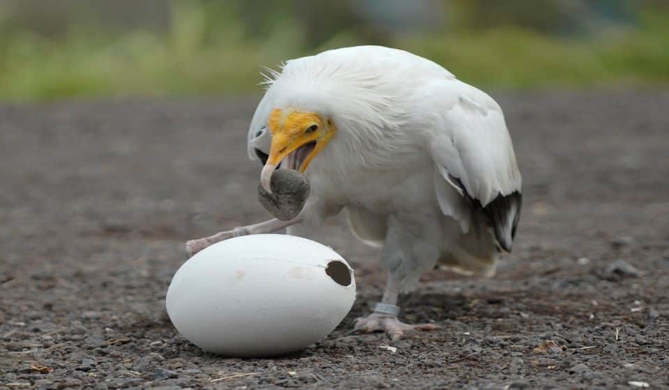 Aasgieren eten meer dan enkel ‘aas’, ofwel vlees van dode dieren. Met hun tengere bouw is het voor hen lastig om de concurrentiestrijd om voedsel te winnen. Ook is hun snavel niet sterk genoeg om zelf een karkas te openen. Om die reden hebben ze ook wat anders op het menu staan, waaronder insecten, kleine zoogdieren en eieren. Voor het openen van die eieren heeft de aasgier een trucje bedacht. Ze gebruiken een steen om het ei open te slaan. Handig, zo’n gereedschap uit de natuur!