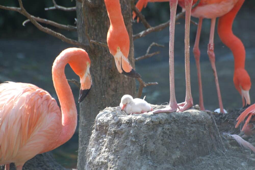 Bij het voeren van de jongen gebeurt iets bijzonders. De flamingo’s voeren de jongen namelijk zogeheten ‘kropmelk’. Alleen duiven doen dat ook! Dit product is rood van kleur, veroorzaakt door de natuurlijke kleurstoffen (carotenoïden) die in het voedsel zitten. Jonge flamingo’s zijn grijs als ze net zijn uitgekomen en blijven ook even een grijs verenkleed houden. Als de vogel groeit, en dan ook meer carotenoïde stoffen binnenkrijgt, worden de veren langzaamaan roze.